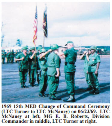Terry McCarl terryamccarl@gmail.com sent over, "Mike: I served with HSC 15th MED Bn. from 11/'68-11/'69. I was a 1LT, MSC, the Division Sanitarian. I worked with the Preventive Medicine Officer, primarily in water supply, food service sanitation, waste disposal, rodent control, mosquito control and malaria control. The mission was to keep the troops healthy.